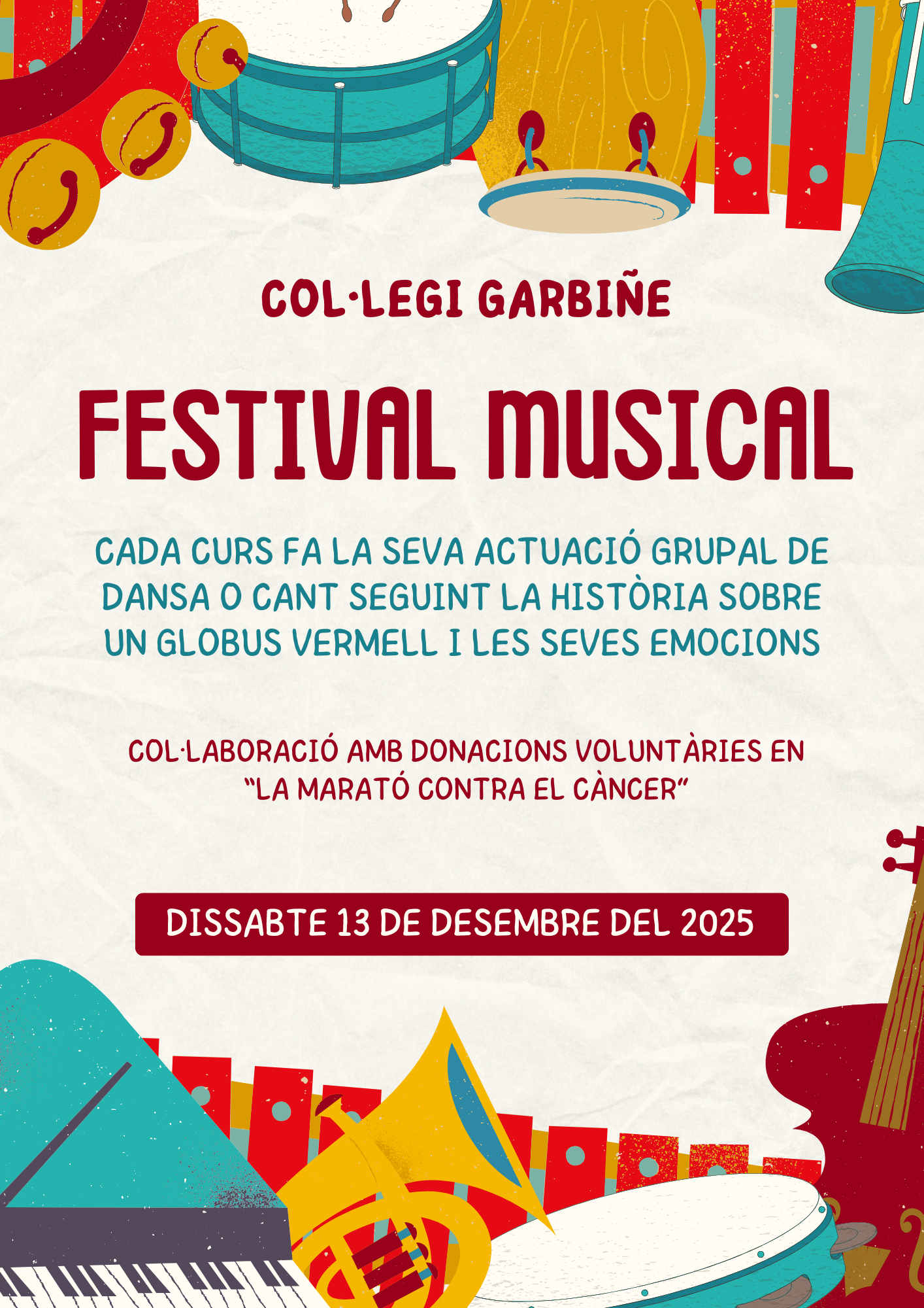 El dissabte 13 de desembre, el nostre col·legi va celebrar el festival musical al teatre del carrer Diputació 277 (Institut Escola Pia Nostra Senyora). El fil conductor aquest any va ser la història d’un globus vermell i les seves diferents situacions que passava per cada emoció. Durant tot el festival va haver una taula amb membres del AMPA de la nostra escola que recollien donacions a una urna per a col·laborar amb “La Marató de TV3” d’aquest any contra el càncer. Es va recavar un gran trosset d’ajuda contra aquesta gran malaltia. Volem agrair a tots/es aquells /es que van participar i van posar el seu granet de sorra! GRÀCIES! Va ser un dia molt emocionant i totes les actuacions van agradar al públic.